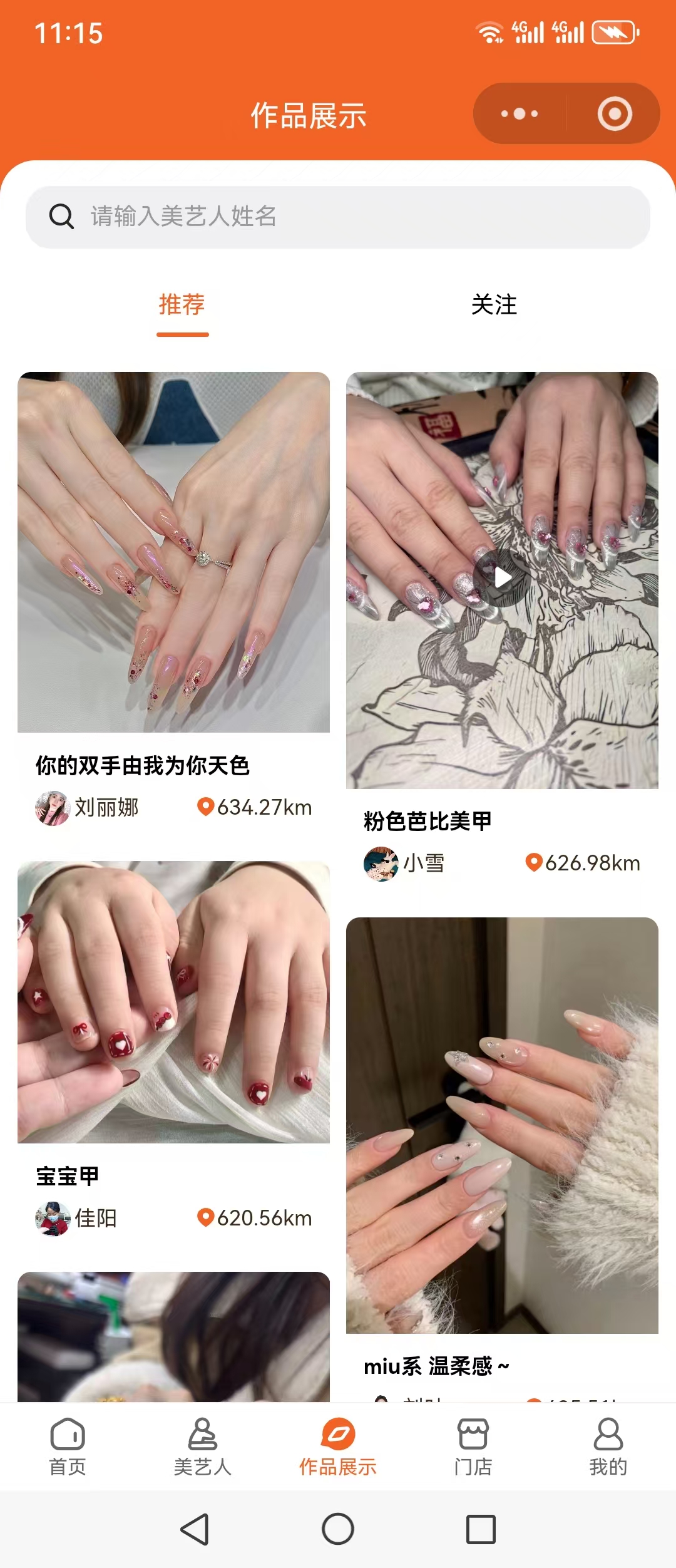 - 作品信息:每張作品標注標題(如“粉色芭比美甲”“miu系溫柔感美甲”)、美藝人姓名、與用戶的距離,直觀體現服務效果與可達性。